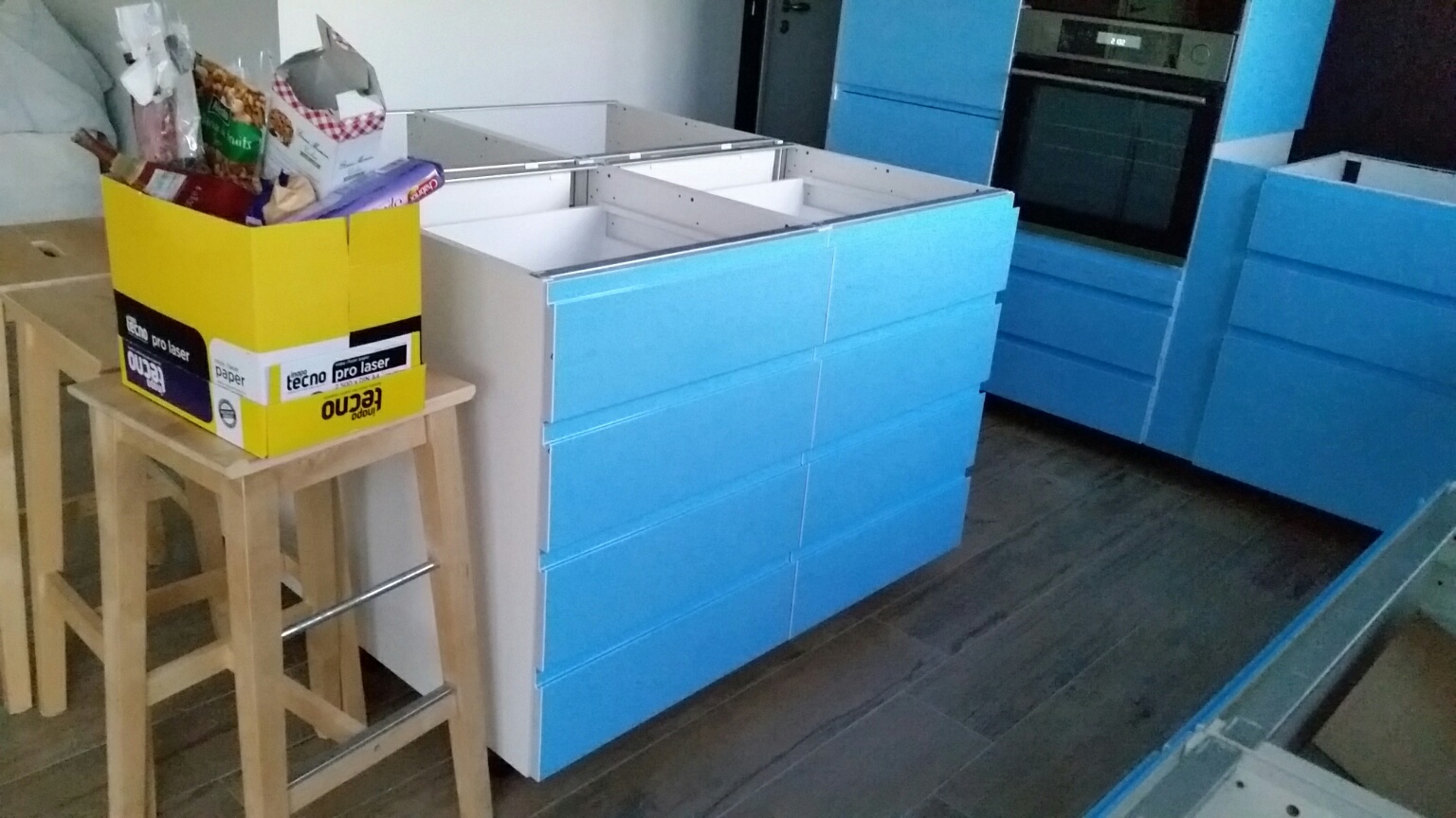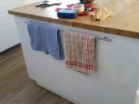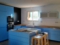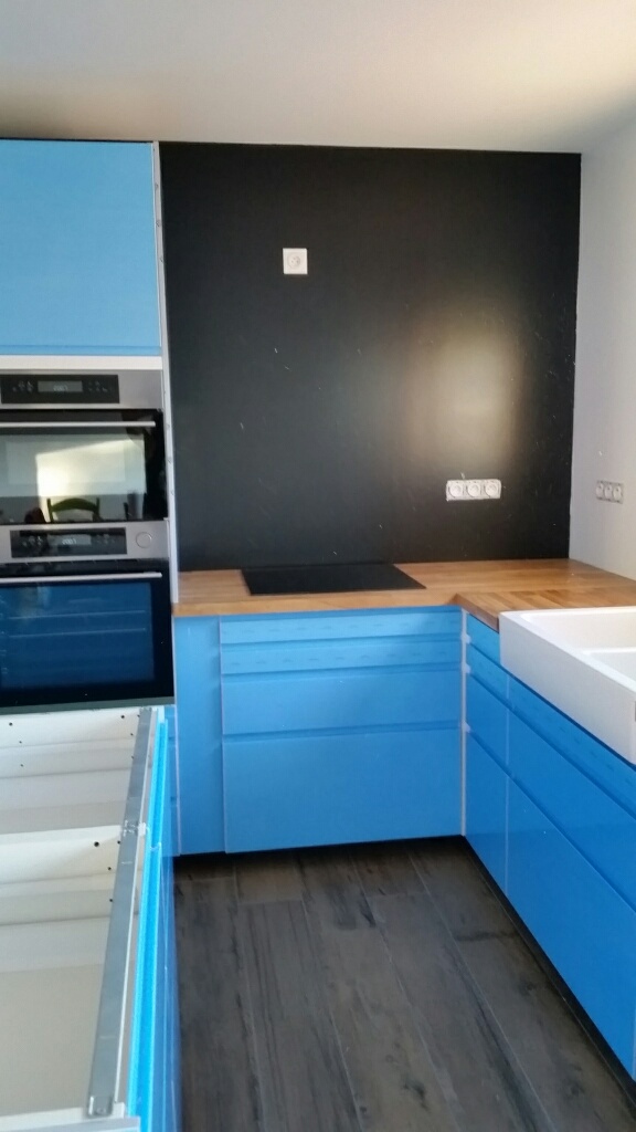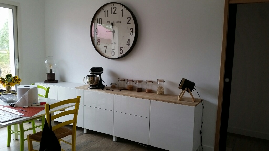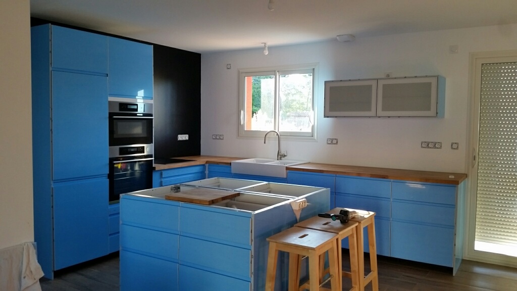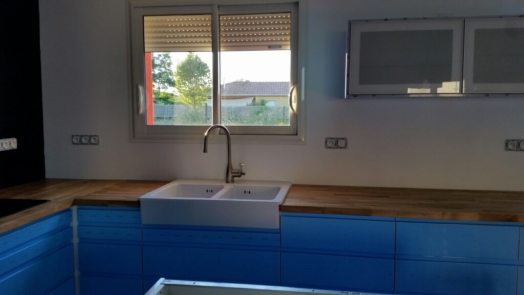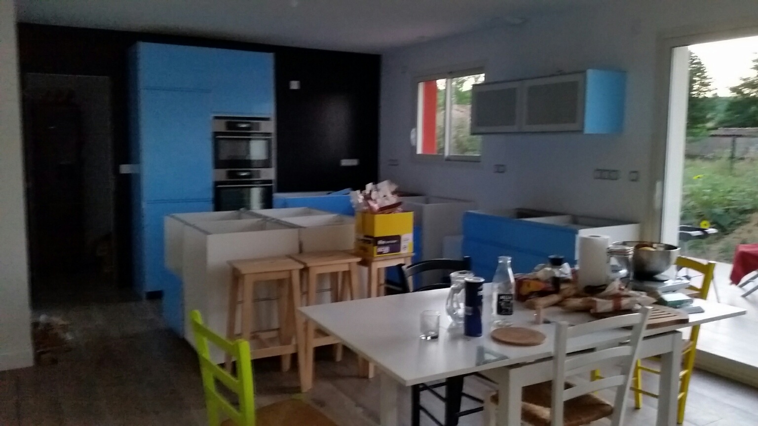 Ca y est, nous habitons officiellement dans notre maison! Nous avons rendu hier soir les clés de notre appartement (état des lieux prévu en août, car absence de la propriétaire). Le parquet des deux autres chambres a également été réalisé (un grand merci à mon frérot!!!!). Nous avons également avancé le montage des caissons de l’ilot central.