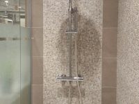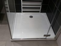 Nous avons payé une plus-value pour avoir une colonne de douche pluie. Le bac de douche est classique, en dimension 90×90.