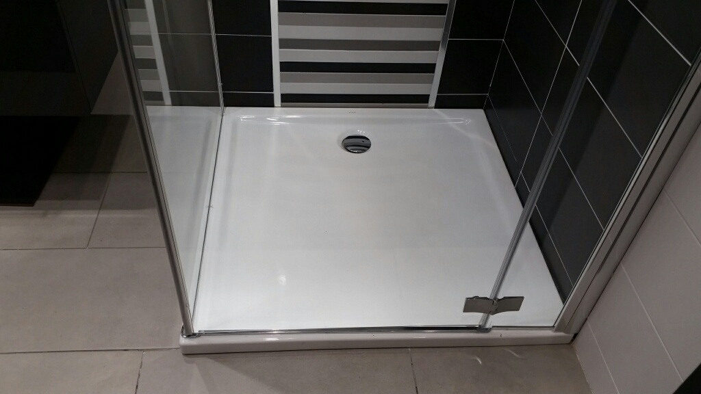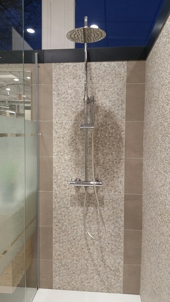Nous avons payé une plus-value pour avoir une colonne de douche pluie. Le bac de douche est classique, en dimension 90×90.