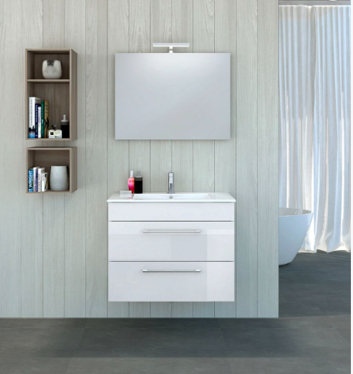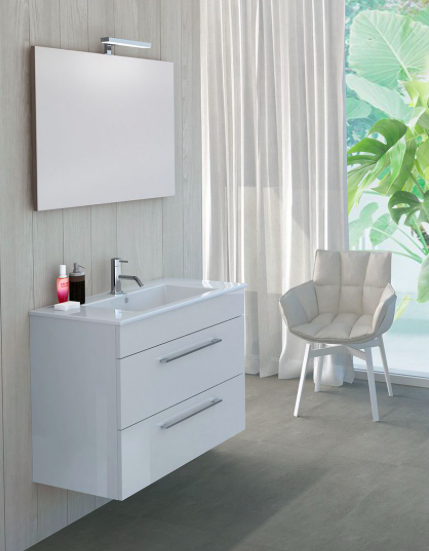 Nous avons choisi le meuble SMART de chez Adattocasa en blanc laqué 100cm, avec le miroir assorti. Il a un siphon déporté afin de ne pas avoir de « trou » dans le premier tiroir. Le même meuble en 55 sera disposé dans la salle d’eau.