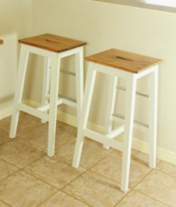 L’ilot central fait 127cm de large par 186cm de long. Il est constitué de meuble standards collés dos à dos. Nous avons déjà prévu une arrivée électrique afin de pouvoir disposer de prises électriques. Il y a des meubles de cuisine seulement sur 124cm. Le reste sera utilisé comme bar pour pouvoir manger à 3 ou 4 personnes. Nous pensons acheter des tabourets ikea en bois et potentiellement les repeindre pour donner quelque chose comme ci-dessous.