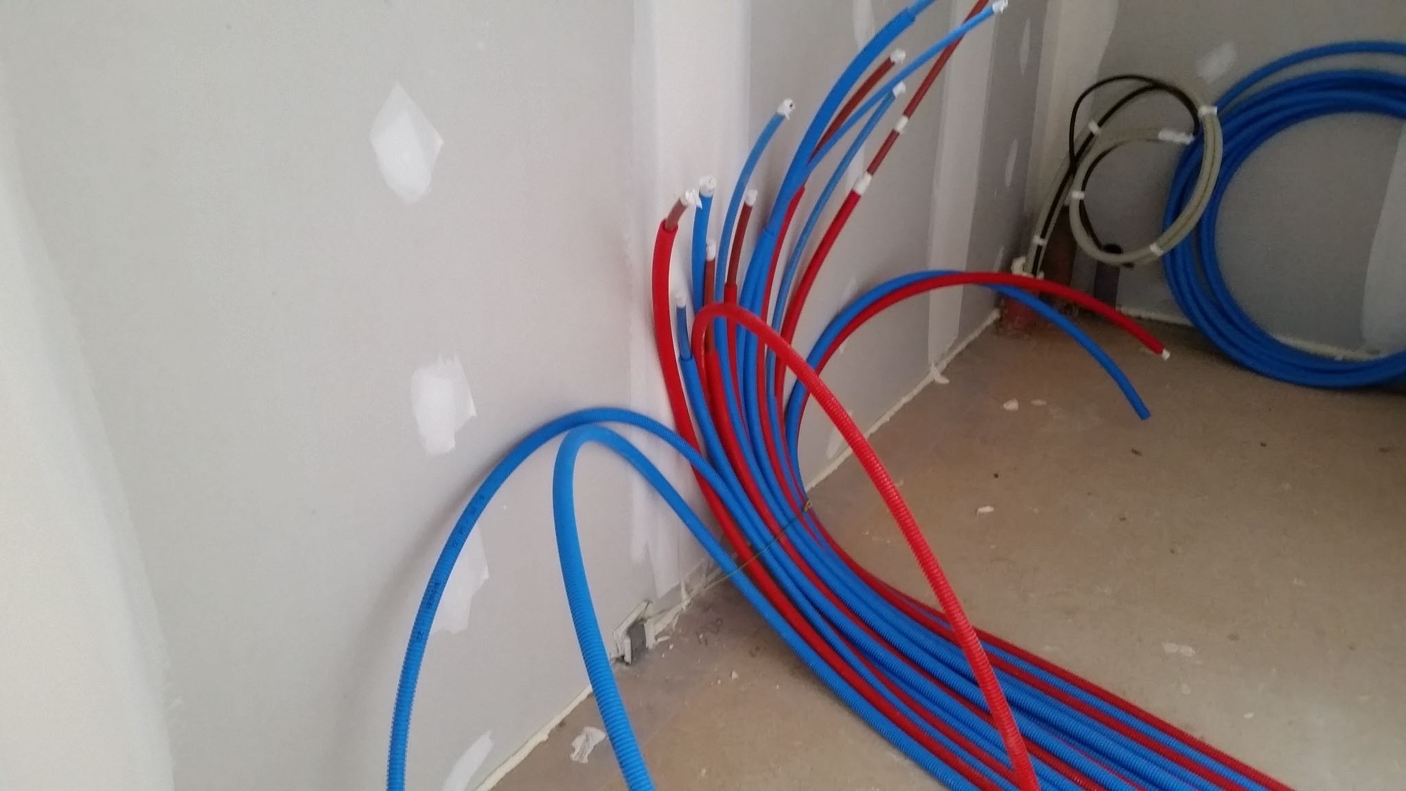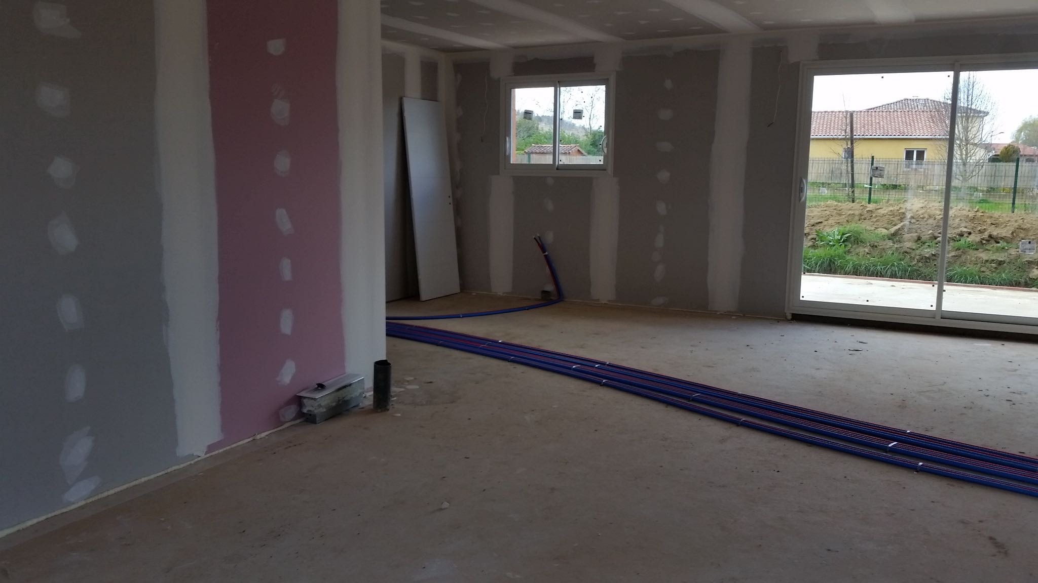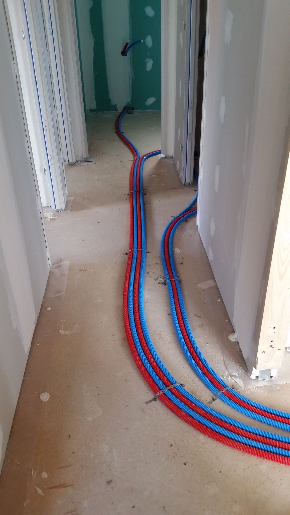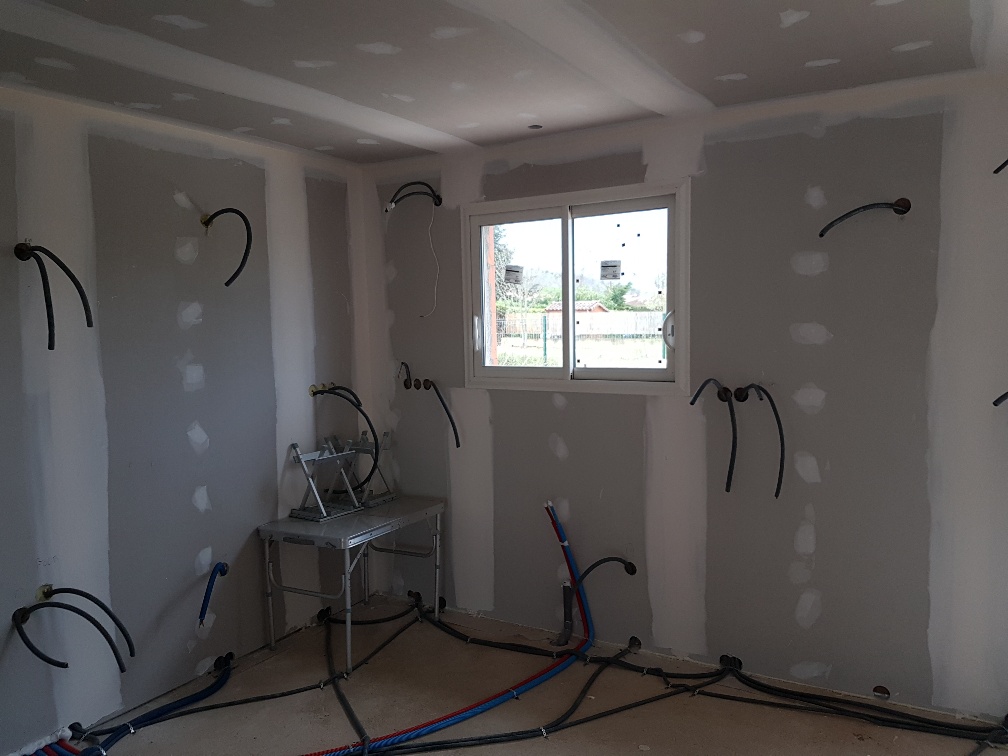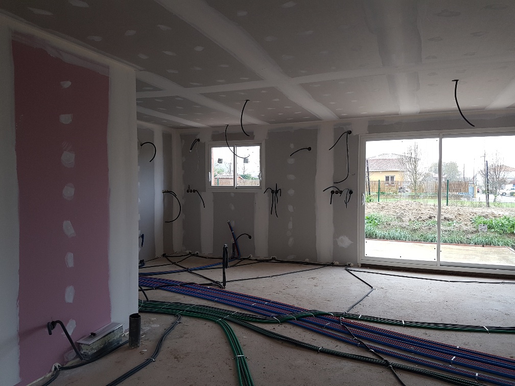 La premier passage de jointeur a eu lieu la semaine dernière. Cette semaine, le chauffagiste installe les tuyaux pour la pompe à chaleur. Le plaquiste et le jointeur reviendront ensuite finir de plaquer et jointer. La semaine prochaine, plombier a priori.