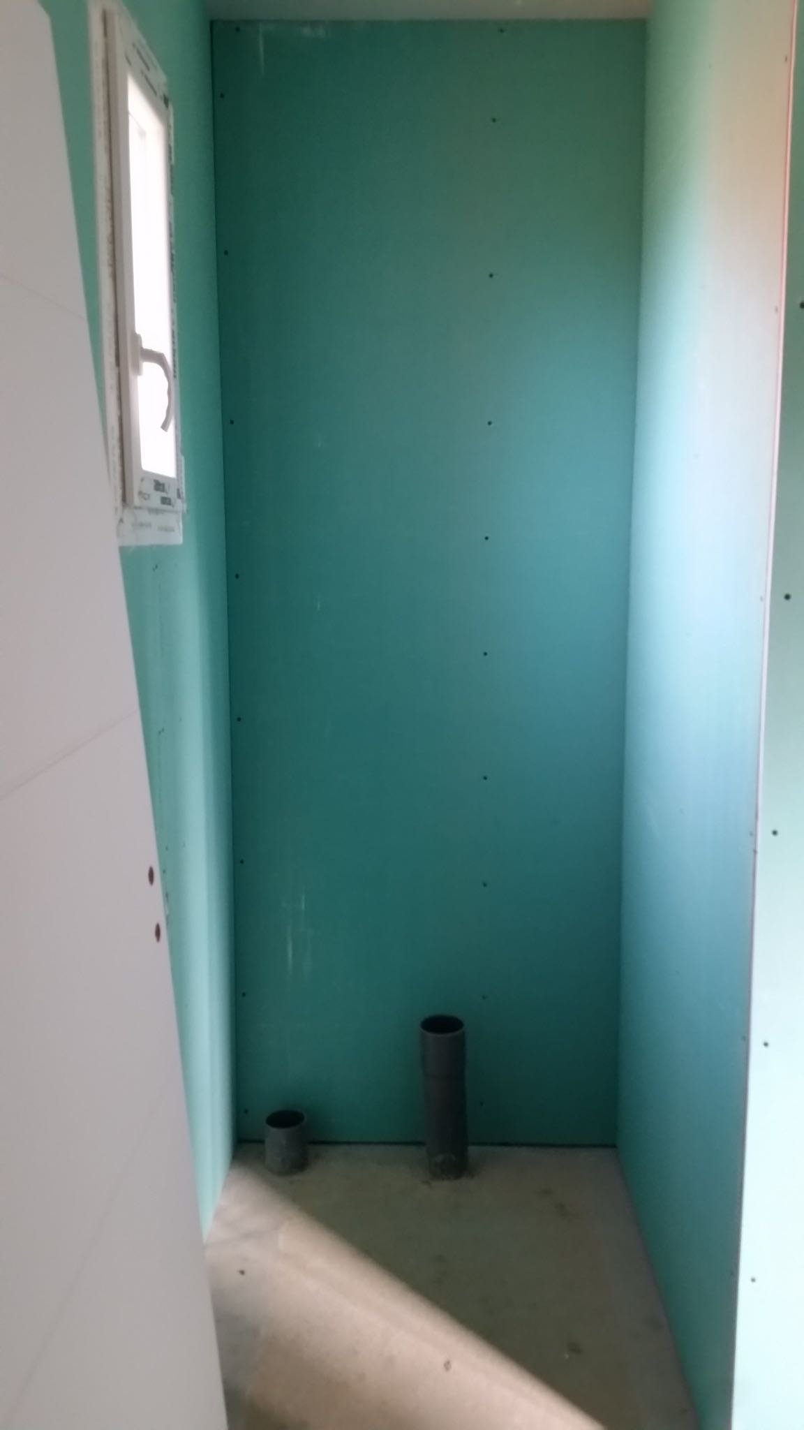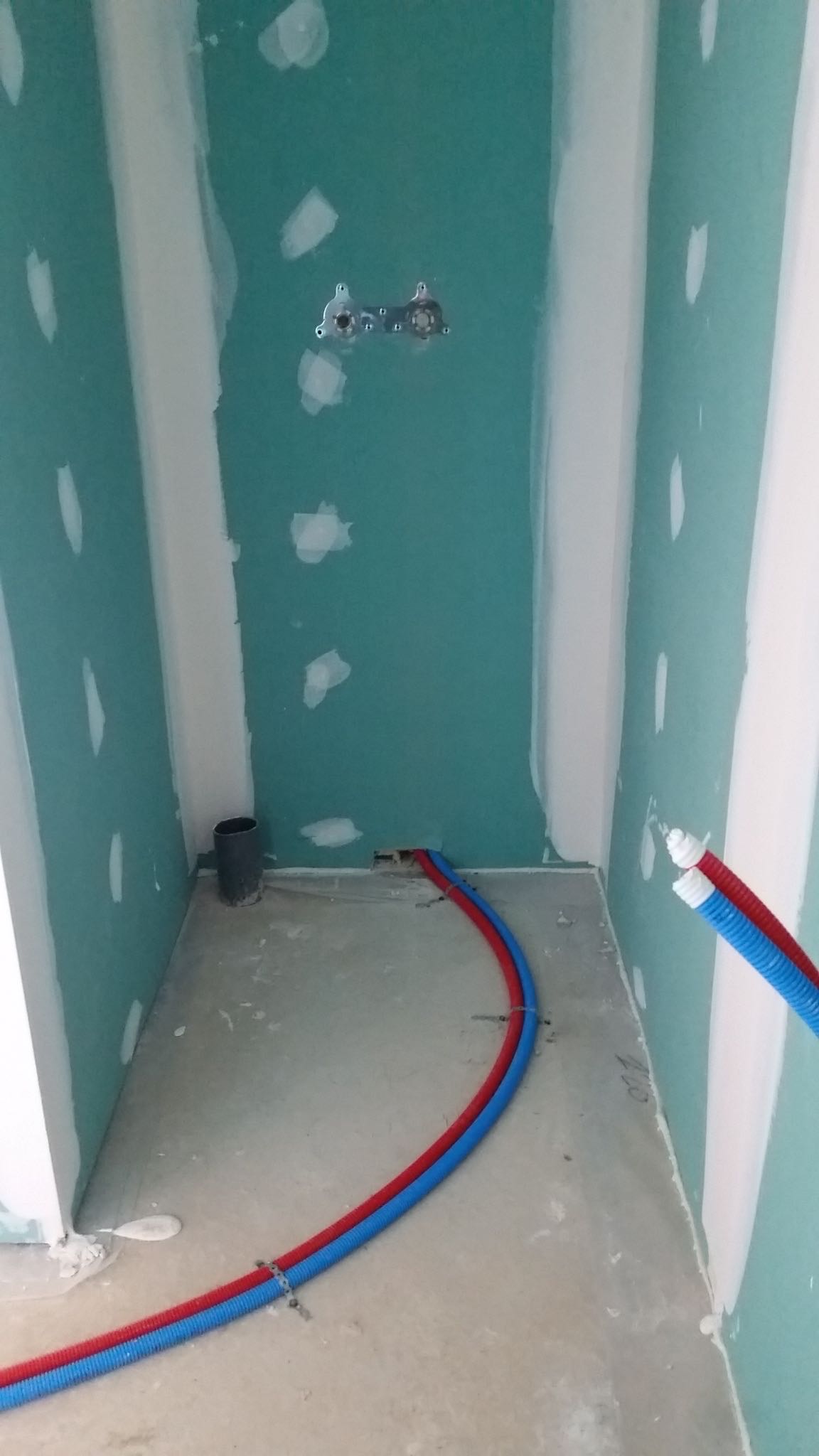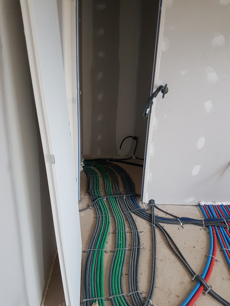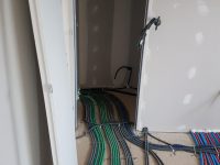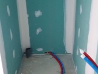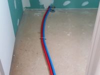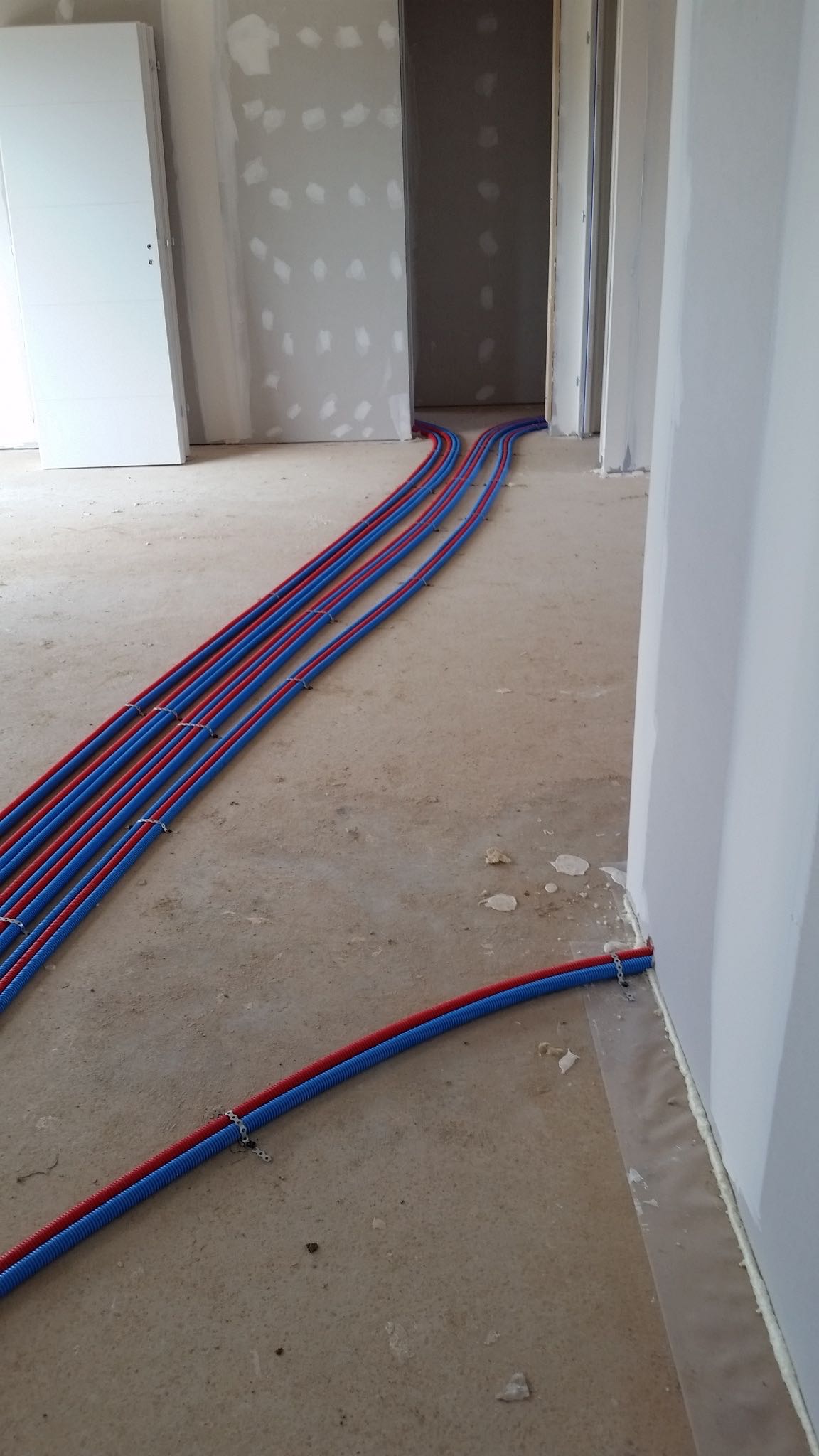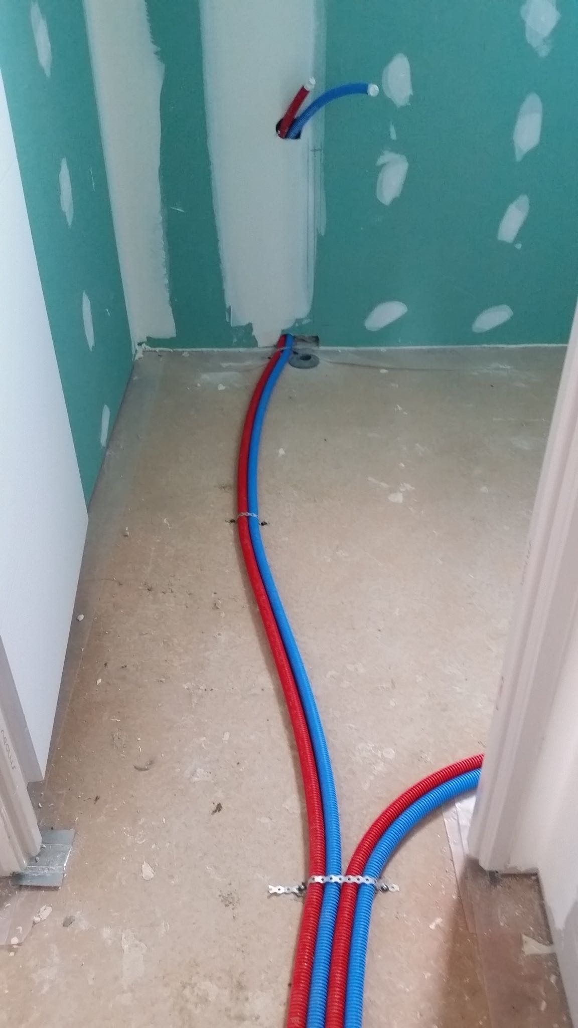 La premier passage de jointeur a eu lieu la semaine dernière. Cette semaine, le chauffagiste installe les tuyaux pour la pompe à chaleur. Le plaquiste et le jointeur reviendront ensuite finir de plaquer et jointer. La semaine prochaine, plombier a priori.