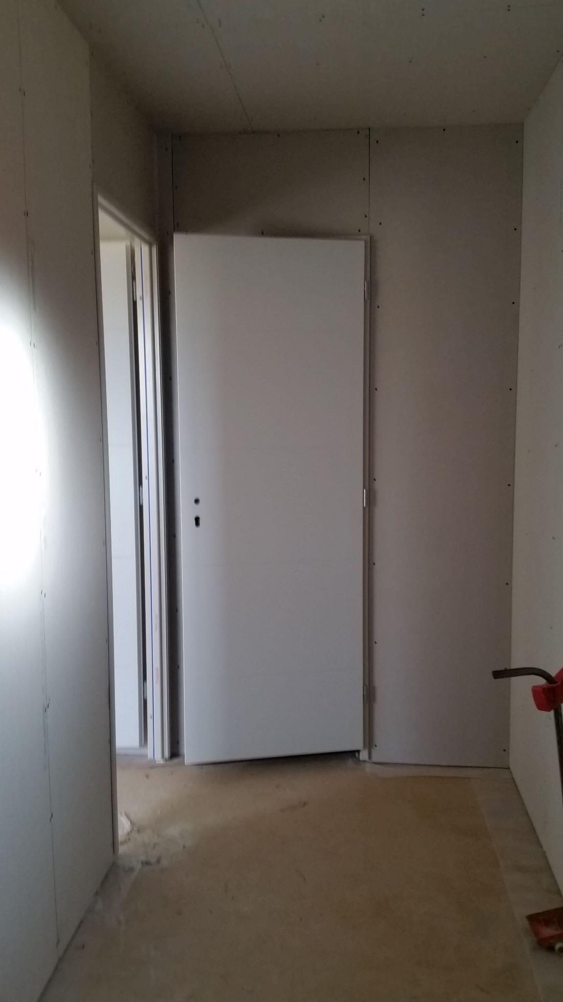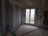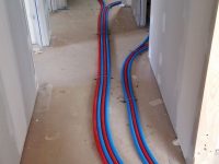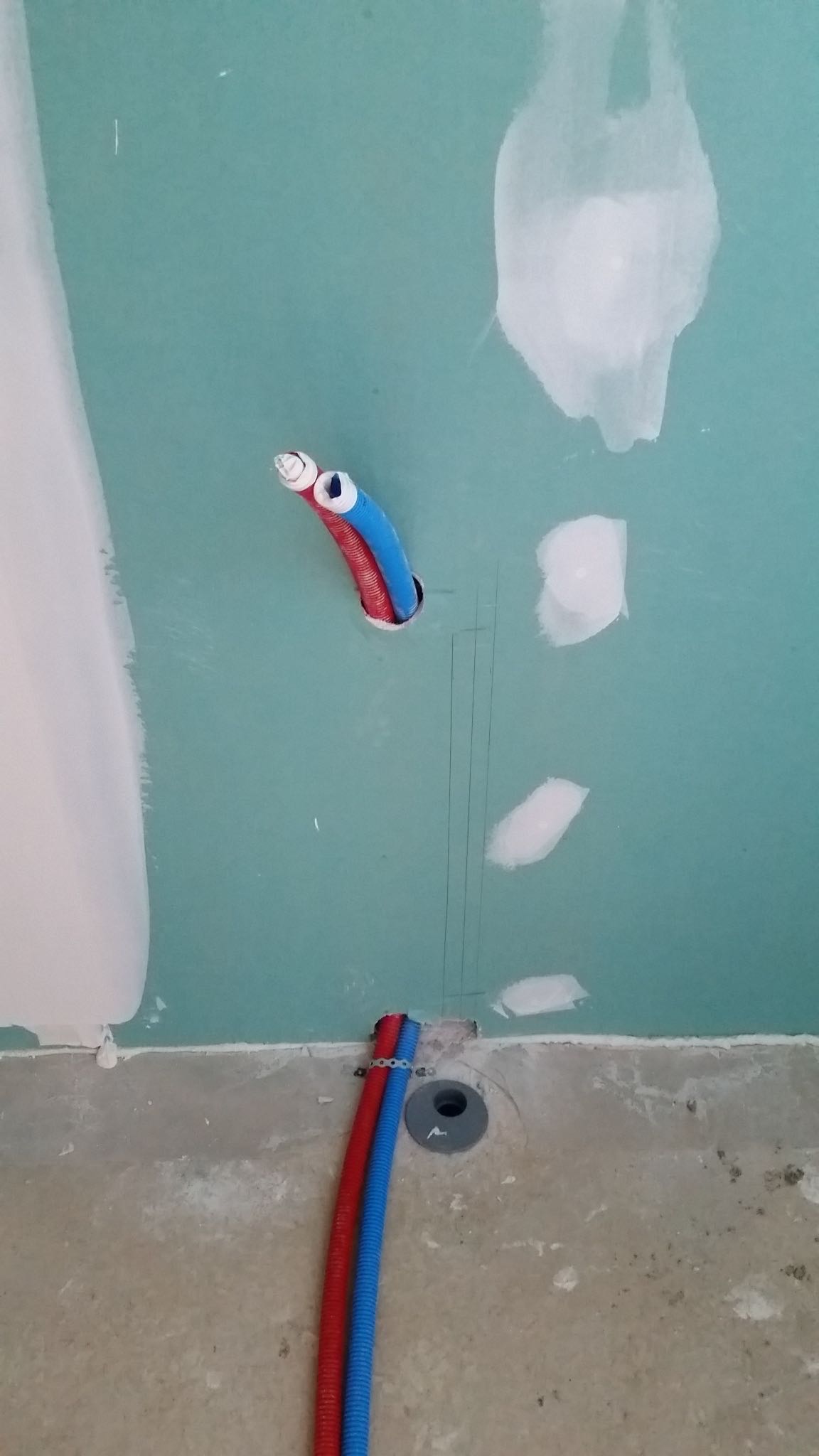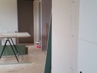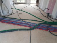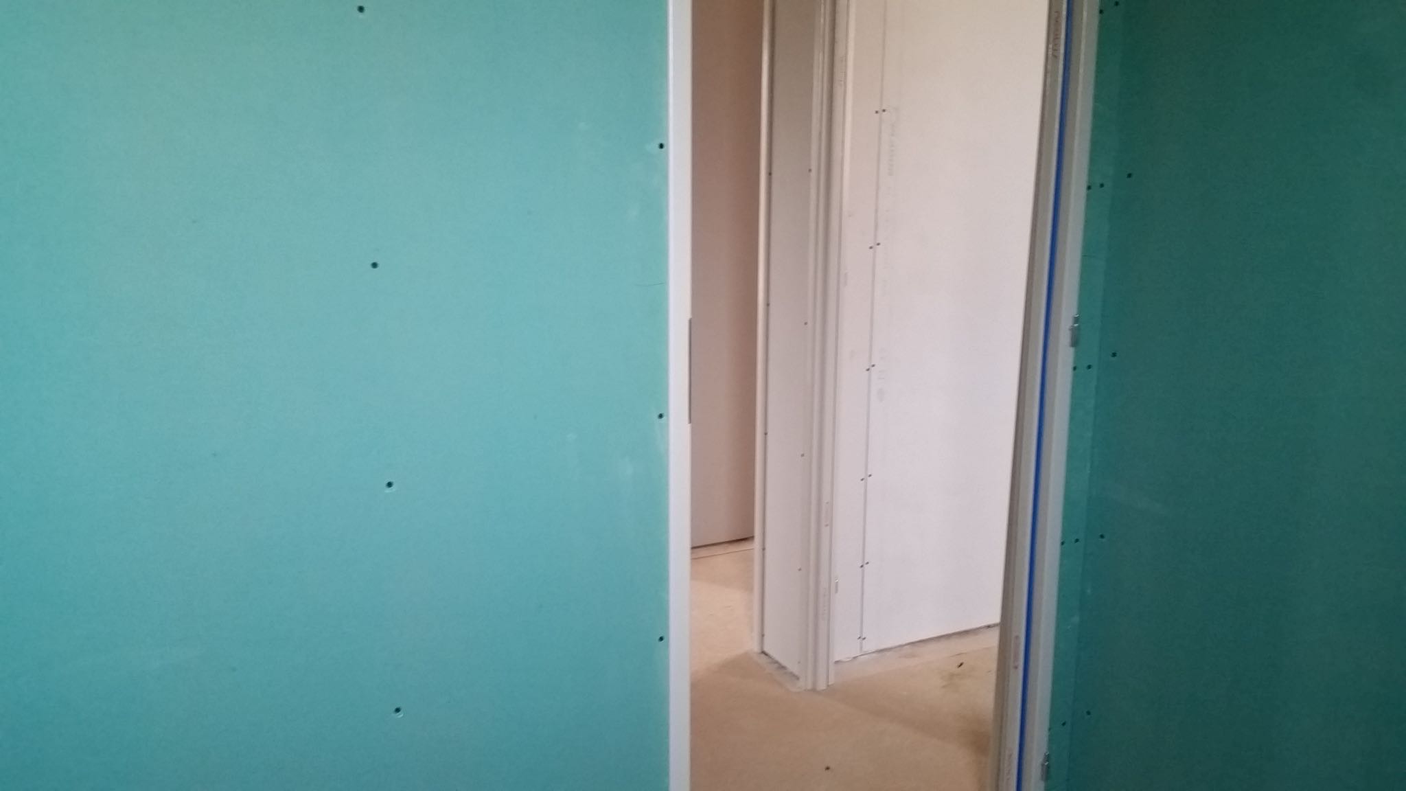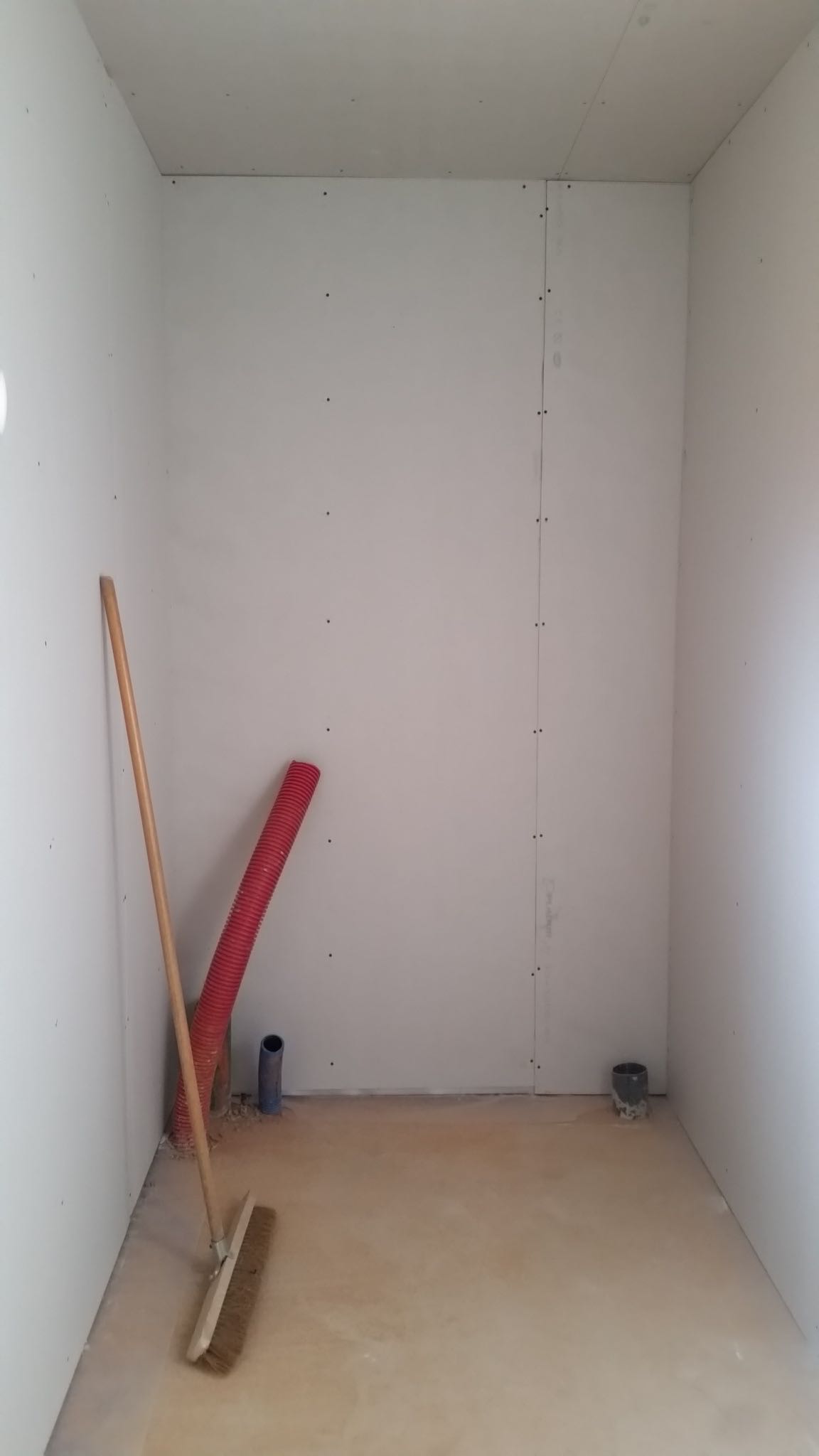 La premier passage de jointeur a eu lieu la semaine dernière. Cette semaine, le chauffagiste installe les tuyaux pour la pompe à chaleur. Le plaquiste et le jointeur reviendront ensuite finir de plaquer et jointer. La semaine prochaine, plombier a priori.